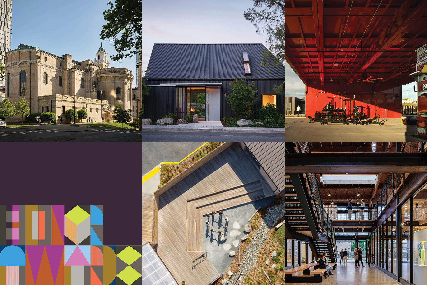 From top left: Saint James Cathedral Portico by Gerrick Office, iolair by GO’C, Modular Fire Station 67 by Wittman Estes, Snoqualmie Tribe Child Development Center by Boulder Associates, West Canal Yards by Graham Baba Architects. Photos by Andrew Storey, Nic Lehoux, Ed Sozinho, Kevin Scott, Matthew Millman and Lara Swimmer/Esto.