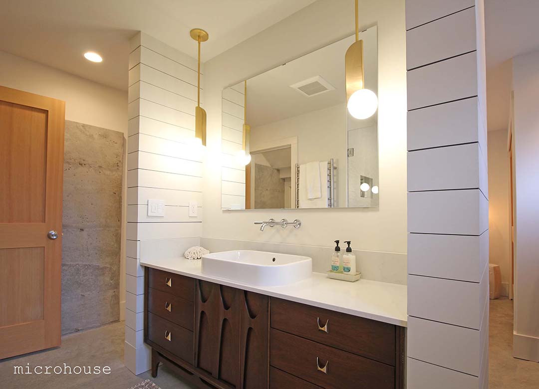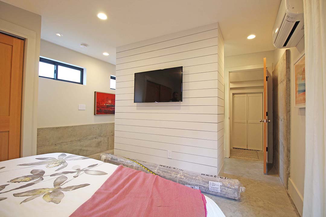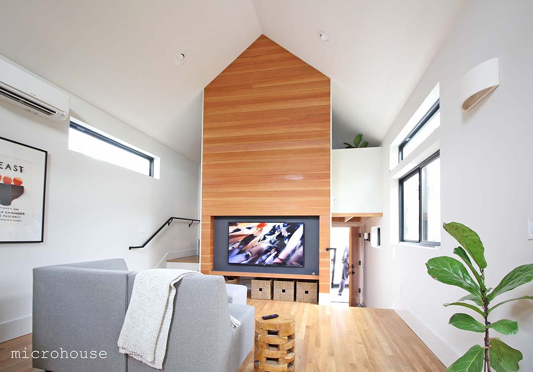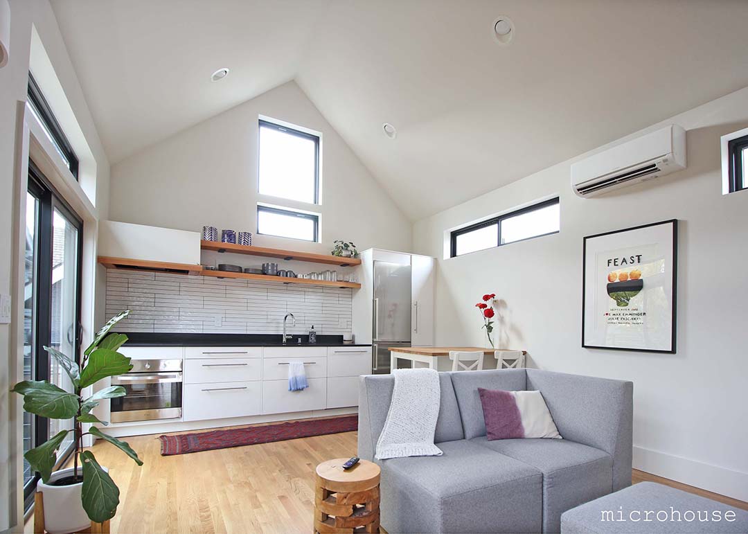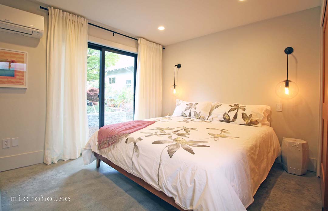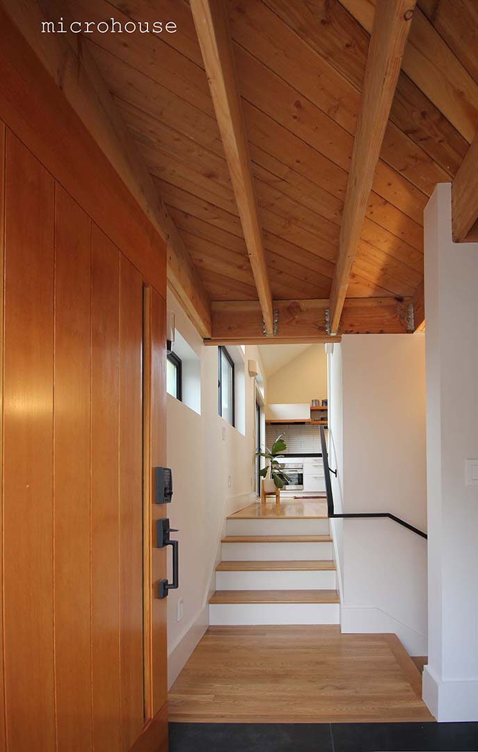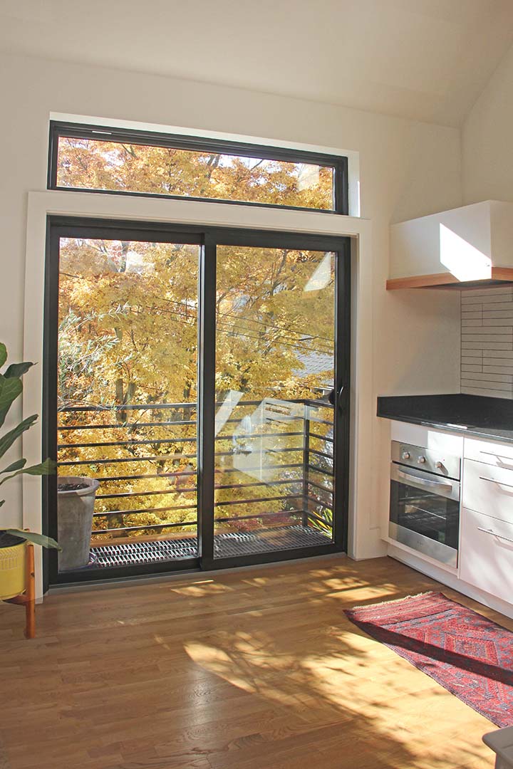 The site is very small and steeply sloping with the large family home and parking to maintain. As it true of most DADUs, along with great challenges come opportunities. The slope and alley access gave us the opportunity to achieve a split level home with a large master suite, an open floor plan with vaulted ceilings, a balcony off of the kitchen, 2 bathrooms, and a 2nd lofted bedroom.