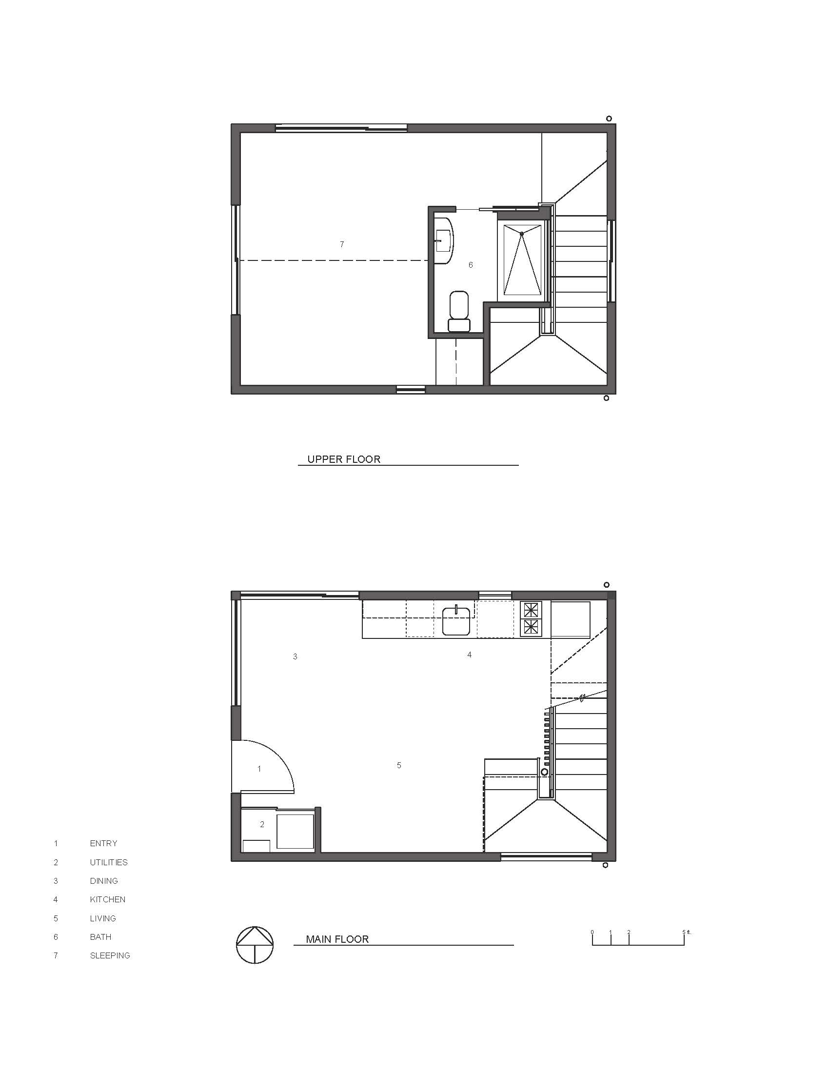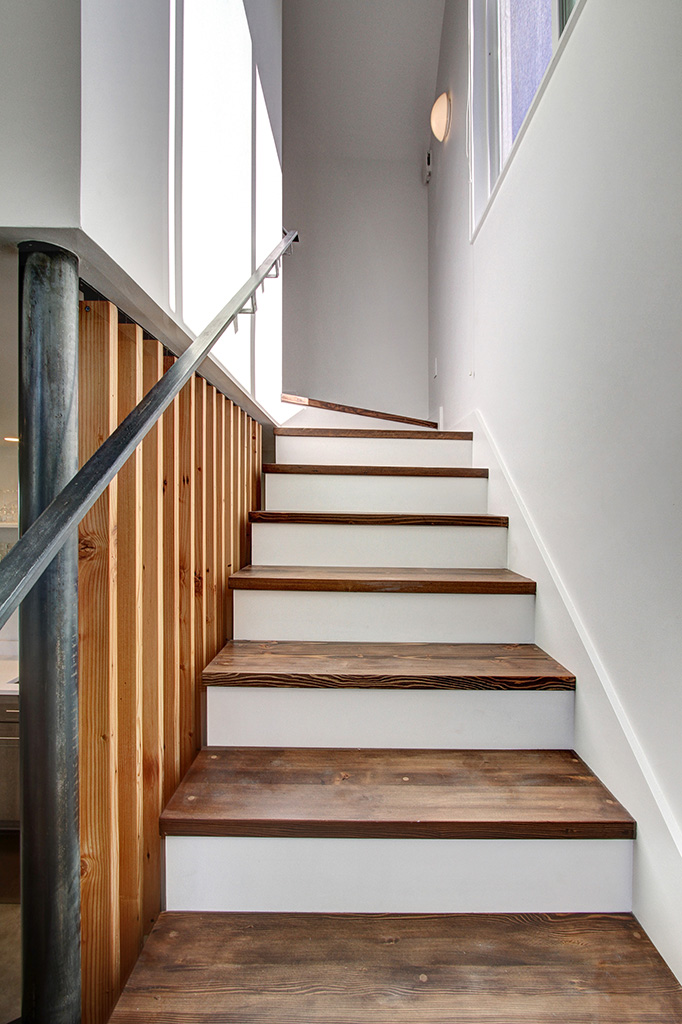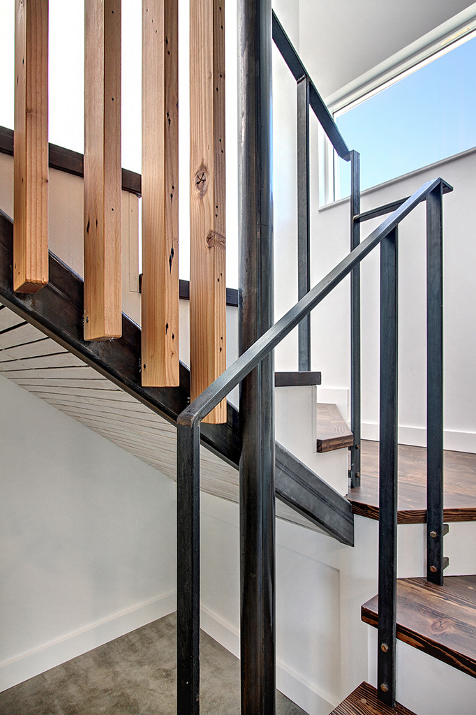 The main floor comprises the living space with a kitchen, laundry, dining, and lounging area. The open staircase, with its raw steel and salvaged fir screen, leads to a spacious sleeping area and full bath.