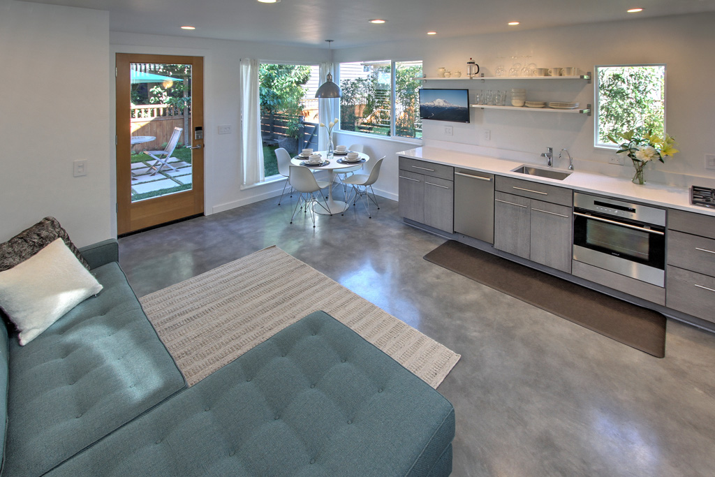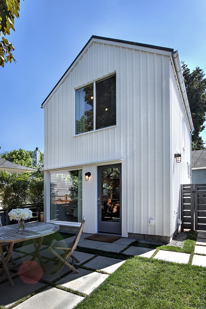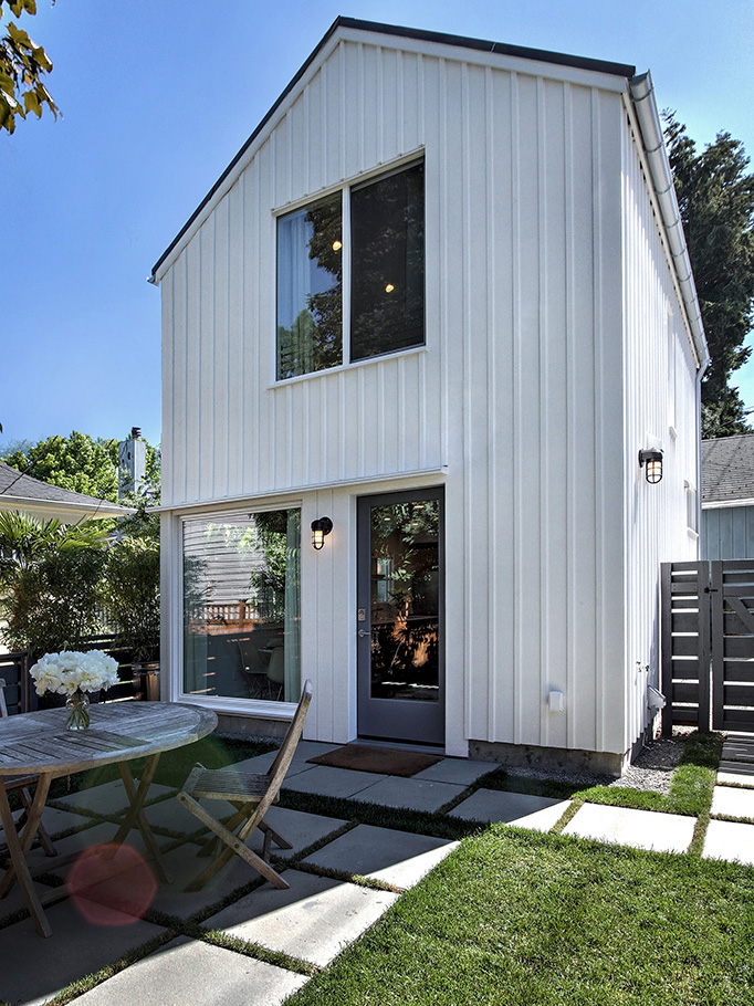 This small Seattle DADU, named the Backyard Cabin, was envisioned by its owners to be a place where they could live with their 2 toddlers while they constructed their dream home on the same property. When the house was complete, they would use the cabin as a rental, and, perhaps in the far future when the kids are grown, use it as their own home.