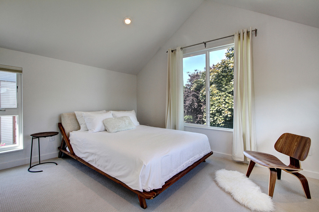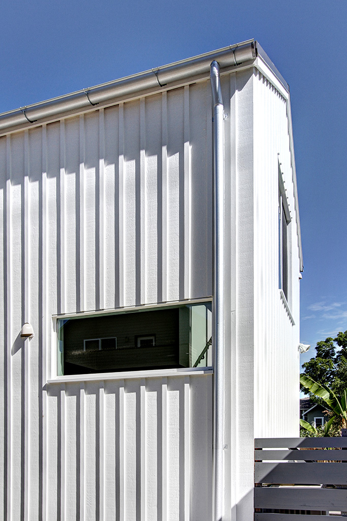 The exterior fenestration follows the same principles as the interior, being light and restrained. The cedar board and batten siding is kept white, creating depth and pattern by means of shadow, even on an overcast Seattle day.